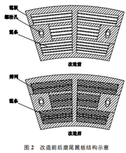 上述解決出料篦板堵塞的措施只能起到緩解出料篦板的堵塞、延長出料篦板的清理周期的作用,不能從根本上徹底解決問題。因此,還需對球磨機出料篦板的結(jié)構(gòu)進行改造。通過利用現(xiàn)有材料自制防堵塞篦板,降低堵塞影響,增大磨尾通風(fēng)面積,解決飽磨問題。改造前后磨尾篦板結(jié)構(gòu)示意見圖2。