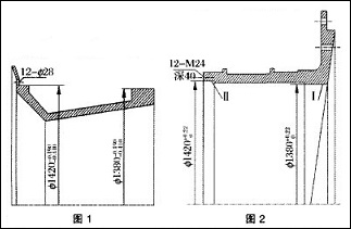 以Φ4000×1400濕式自磨機為例。濕式自磨機進料部由進料襯套和中空軸組成,它們的結(jié)構(gòu)分別如圖1和圖2所示,該結(jié)構(gòu)有兩個配合面,為Φ1380面和Φ1420面,進料襯套上的兩個配合面公差均為-0.410~-0.190,中空軸上的兩個配合面公差為0~+0.220,兩個相對應(yīng)的配合面之間所形成的配合間隙大為0.63,小為0.19,中空軸前端有12個周布的、深度為40的M24內(nèi)螺紋孔,與進料襯套上的12個Φ28孔相對應(yīng),中空軸和進料襯套之間就用這12根M24 的螺桿進行聯(lián)接,進料襯套以這l2根螺桿進行軸向固定,依靠兩個配合臺面進行徑向固定,進料襯套的運動則通過這l2根螺桿來傳遞。